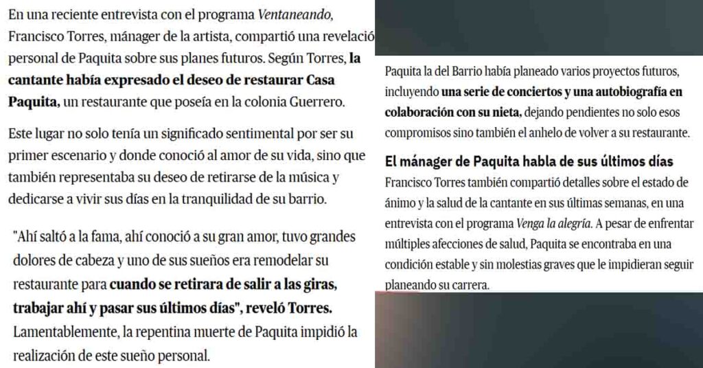 Torres detalló que Paquita soñaba con renovar su restaurante y trabajar allí una vez que decidiera retirarse de los escenarios.